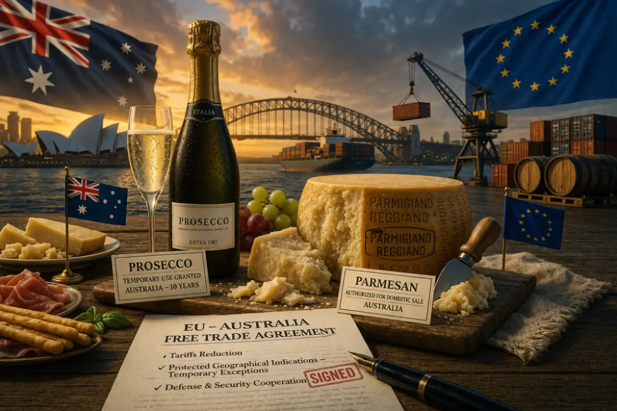L’accordo tra Unione Europea e Australia permette l’uso temporaneo di nomi come “prosecco” e “parmesan” per alcuni prodotti. L’intesa include aspetti di difesa e sicurezza, oltre a promuovere future collaborazioni nella ricerca e innovazione.